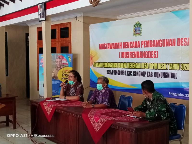 Acara yang dilaksanakan pada hari Kamis, (23/4/20) tempat di Aula Balai Desa Pringombo Kecamatan Rongkop, dihadiri oleh warga masyarakat desa Pringombo yang merupakan wakil dari masyarakat. Mereka adalah Perangkat Desa, Ketua BPD dan Anggota, Ketua LPMD, Karang taruna, TP PKK, Bumdes, Tim RPJMDes, Dukuh se-desa Pringombo, tokoh Masyarakat dan tokoh Agama. Dalam acara tersebut juga dihadiri oleh Forcompinca Rongkop, Kasi Tapem Kecamatan Rongkop, Bhabinkamtibmas, Babinsa Desa Pringombo disamping mereka ikut hadir pula “Nining Wijayanti yang merupakan Pendamping Desa.