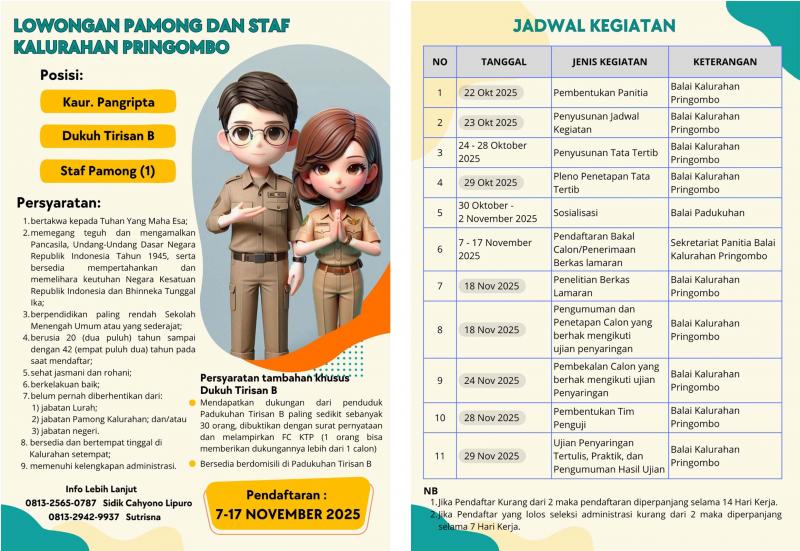 Berdasarkan Keputusan Lurah Pringombo Nomor 46 Tahun 2025 tentang Pembentukan Panitia Pelaksana Penjaringan dan Penyaringan/Seleksi Calon Kepala Urusan Pangripta, Dukuh Padukuhan Tirisan B dan Staf Pamong Kalurahan Pringombo dengan ini diumumkan kepada seluruh masyarakat kalurahan pringombo sebagai berikut: