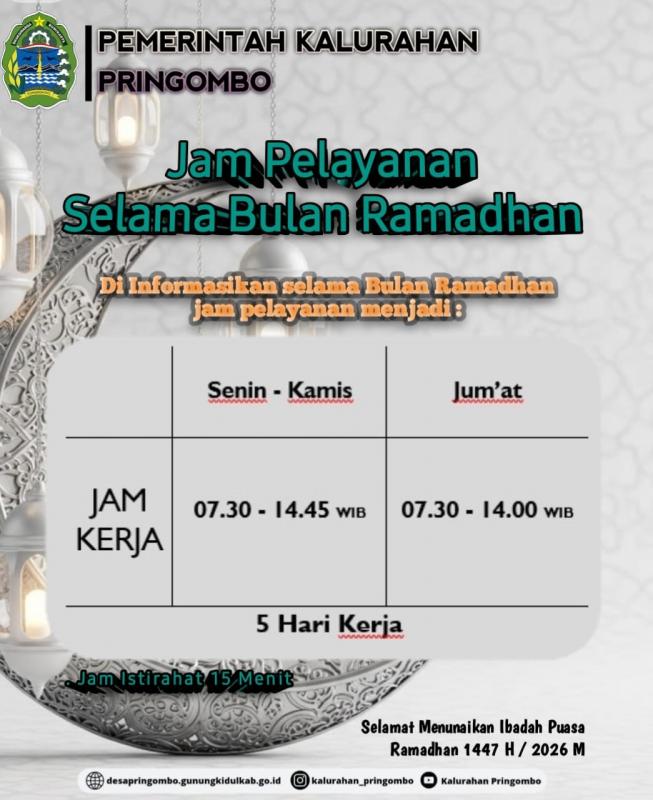 Pringombo, (desapringombo.gunungkidulkab.go.id)-Jam Pelayanan Umum Kalurahan Pringombo Kapanewon Rongkop Kabupaten Gunungkidul selama Bulan Ramadhan. Mendasar Surat Edaran Bupati Gunungkidul Nomor 7 Tahun 2026 Tentang Ketentuan Pelaksanaan Jam Kerja Pegawai selama Bulan Suci Ramadhan 1447 H/ 2026 Masehi.