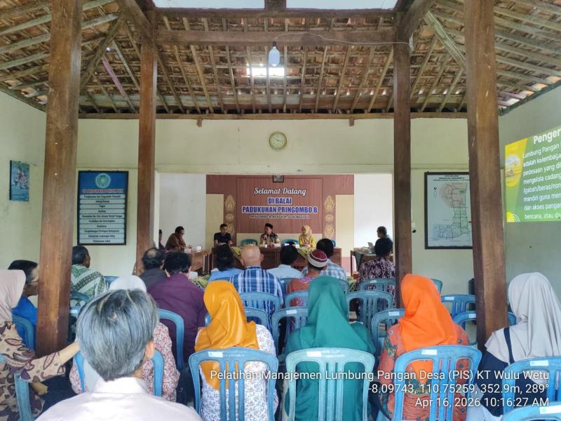 Maka Dinas Pertanian dan Pangan Kabupaten Gunungkidul mengadakan Pelatihan Manajemen Lumbung Pangan Desa (PIS) pada Kamis, (16/4/2026) bertempat di Balai Padukuhan Pringombo B yang di hadiri oleh pengurus KT Wulu Wetu. Narasumber bapak Margiyanto (pengelola LPM Maguru), menyampaikan terkait Manajemen Stok dan Kemasan yang meliputi 2 poin, 1. proses Penyimpanan Gabah dan Beras. 2. Pengadaan dan Pengelolaan Gabah serta Beras. Pengendalian Organisme Penyakit Tumbuhan, Mengenal jenis -jenis hama dan penyakit tumbuhan dan cara mencegah adanya penyakit tumbuhan disampaikan oleh bapak Jayadi, STP. Selain dari Dinas Pertanian Dan Pangan Kabupaten Gunungkidul, hadir pula dari BPP Kapanewon Rongkop ( Ibu Tatik ), serta dari Pemerintah Kalurahan Pringombo, Anggun Rilo Pambudi (Ulu-Ulu).